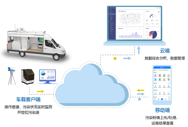 平台可集成常用车载监测数据,并上传至云端进行综合分析与展现,用户可通过手机电脑中的小程序实时查看核心数据和分析报告。平台可对污染物指标定性、定量、定位、定源。