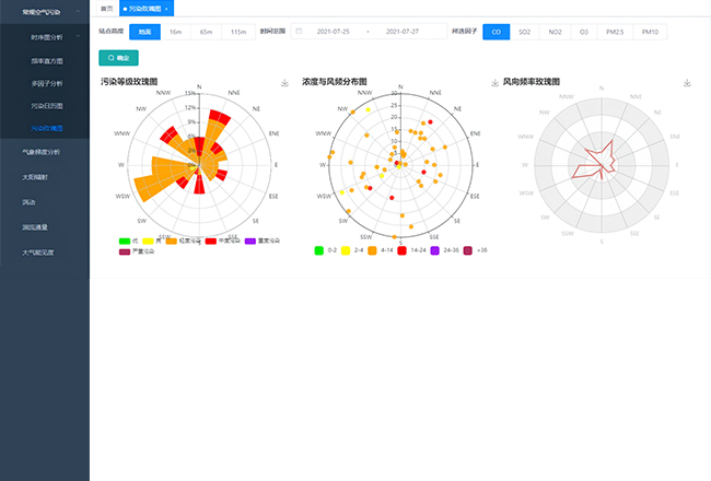 3.结合各类监测仪器数据以及环境气象数据,对污染程度、污染成因、污染特征等内容进行分析及结果展示